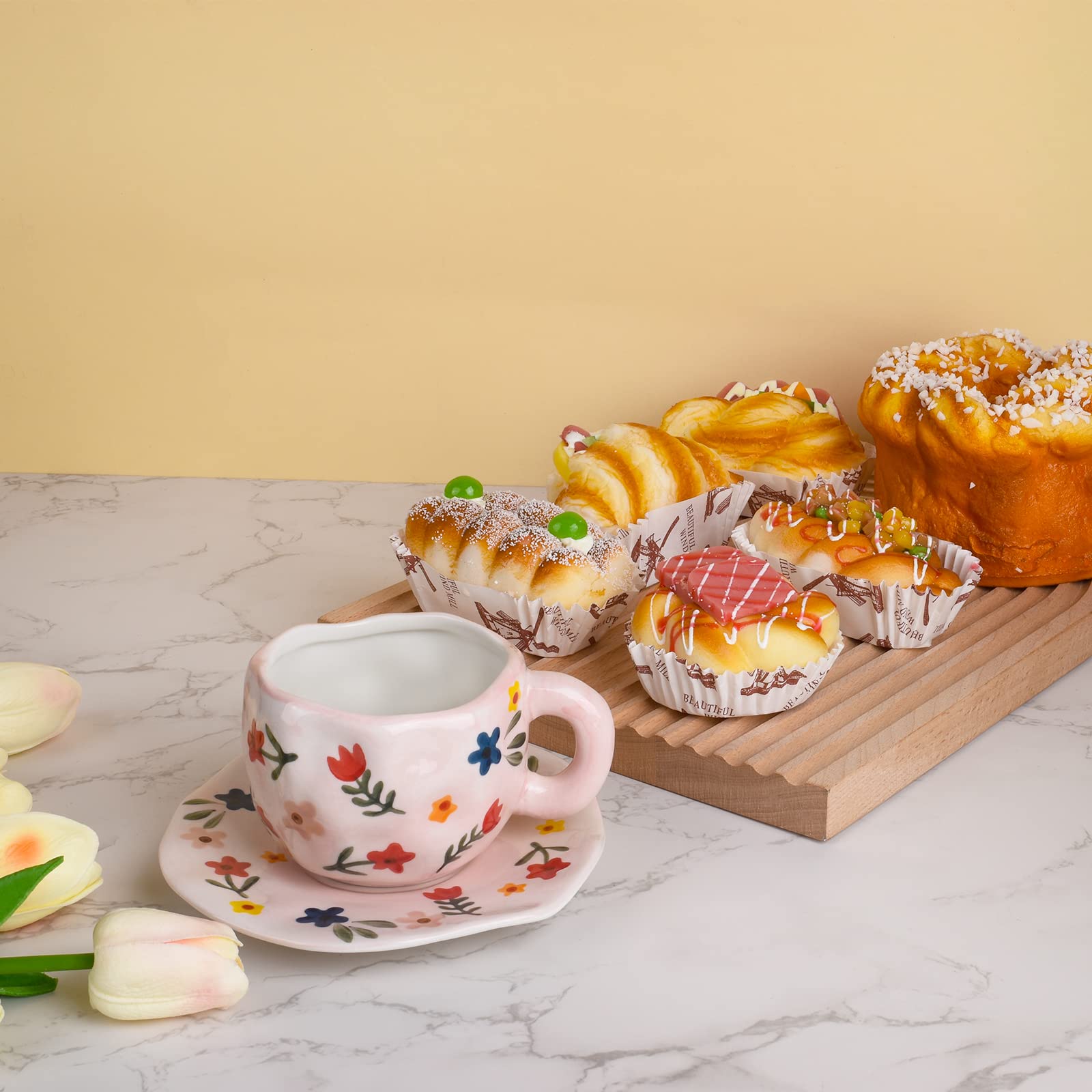 Koythin Ceramic Coffee Mug, Cute Pink Cup for Women with Saucer for Office and Home, Dishwasher and Microwave Safe, 10 oz/300 ml for Latte Tea Milk (Floral)