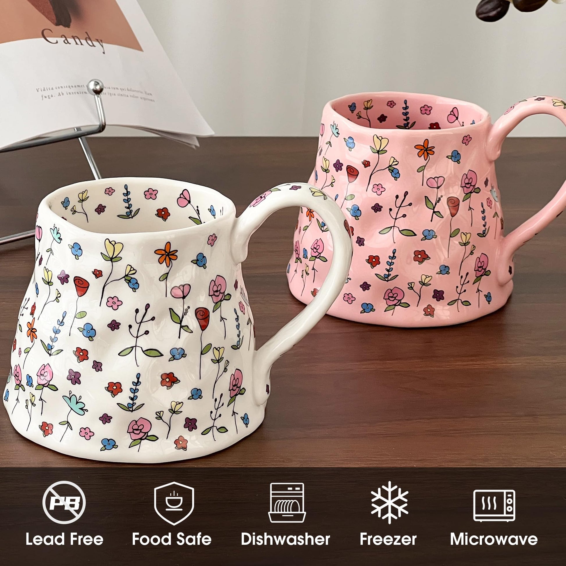 Large Ceramic Coffee Mug Pink Cute Flower with Handmade Big Handle, 20oz Girly Floral Tea Cup for Women Mothers Day Gifts, Novelty Irregular Oversized Mugs for Latte Tea Milk Cocoa