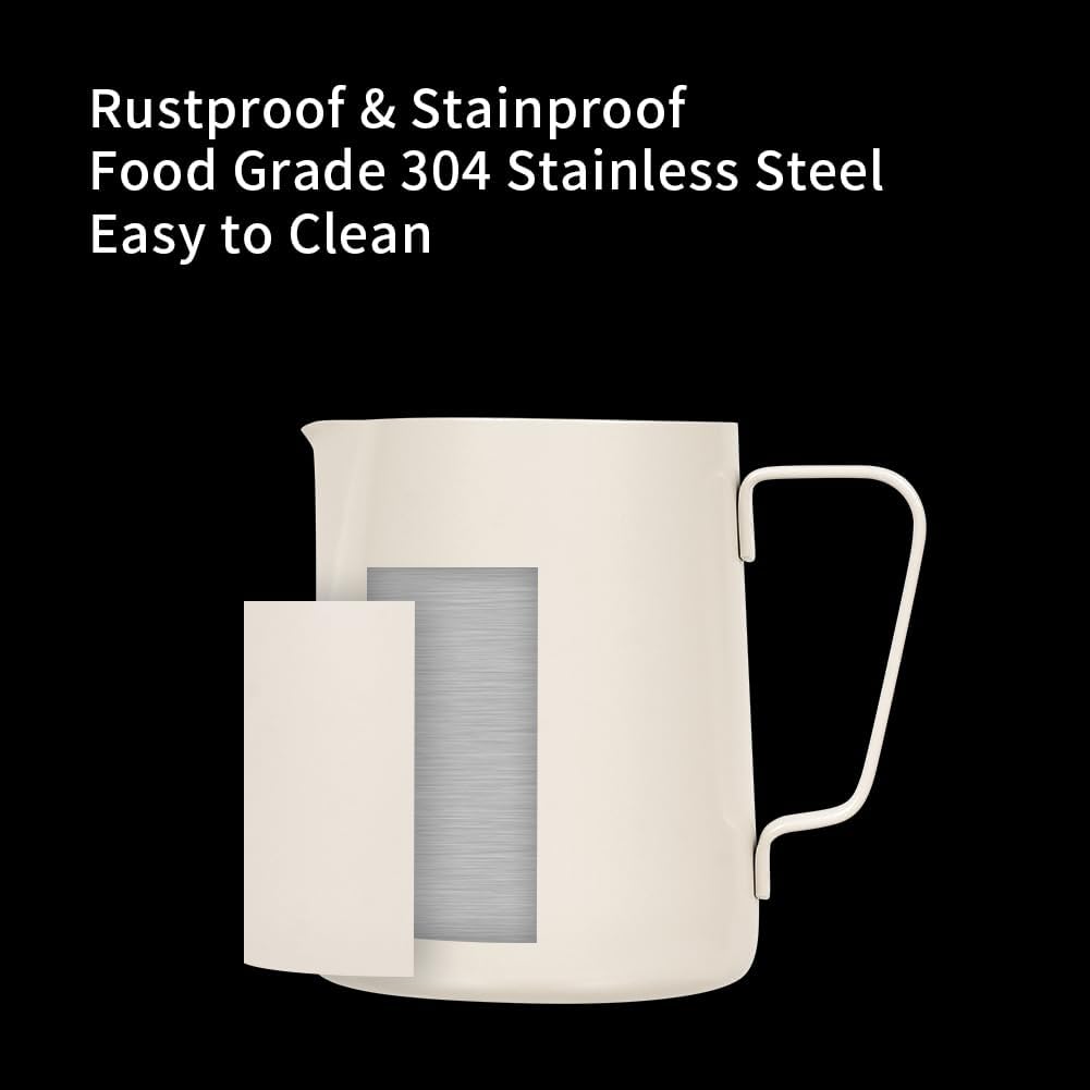 - PREMIUM MATERIAL: watchget milk frothing pitcher is made of food grade 304 stainless steel with creamy white coating which is durable and sturdy, wear-resistant and heat resistant. Unbreakable for daily use and can serve you a long time. Easy to clean and use, it offers excellent temperature control.