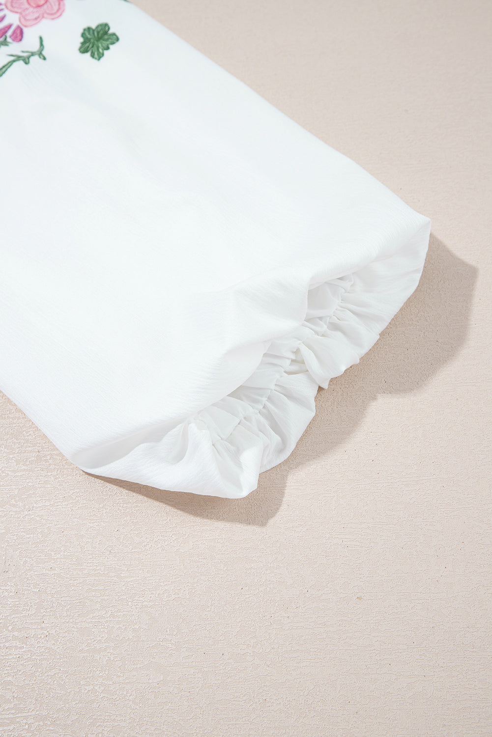 - This babydoll blouse exudes an air of elegance with its delicate white hue and intricate floral embroidery, perfect for a romantic look.